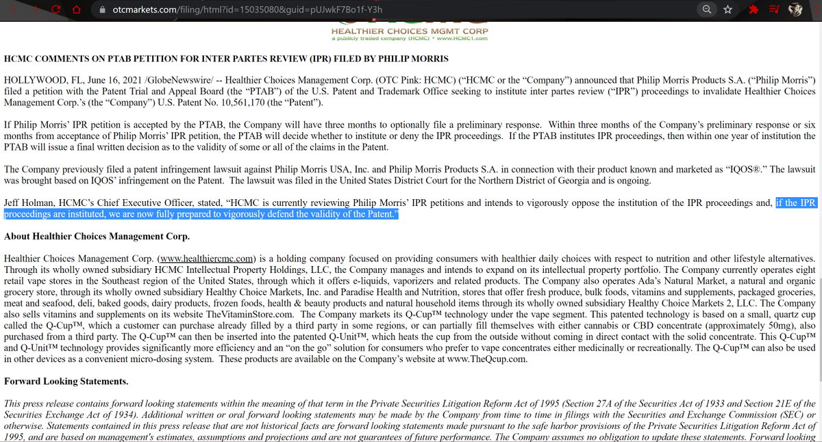 HCMCs lawsuit includes claims that Phillip Morris is infringing HCMCs patent rights in connection with IQOS an alternative tobacco product marketed and sold by Phillip. This is going to be a quick update on the court case on the status of HCMCs stock and security details. HCMC stock pulled back after it had news regarding its.